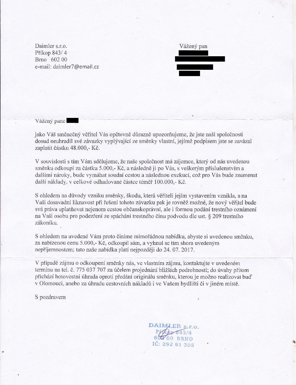 "Také jste dostali v těchto dnech dáreček od Daimlera ? Můj syn ano. Musím říct, že jsme se tomu zasmáli, jak Daimleři krásně zpochybnili hodnotu stejně již tak neplatných směnek v hodnotě 48 000 Kč. Aspoň u mého syna jde o směnku, která je již dva roky promlčená. Kupte si vaši směnku za 5000 Kč, nebo ... . Jde o další ze zoufalých pokusů této firmy, dostat z podvedených občanů IFP, aspoň nějaké peníze, protože standartním postupem přes soud holt nemají nárok. Posuďte sami - viz. obrázek. A hlavně, nenechte se zastrašit a nepřistupujte na tuto "výhodnou" nabídku. Tím byste totiž uznali váš dluh", vzkazuje podvedeným, jeden z našich dopisovatelů.